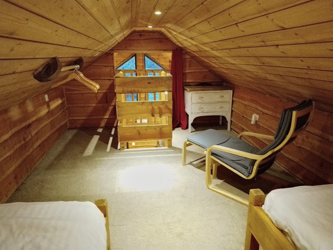 Loft room is accessed via a ladder and has twin beds, clothes hanger, easy chairs, chest of draws and bedside table.