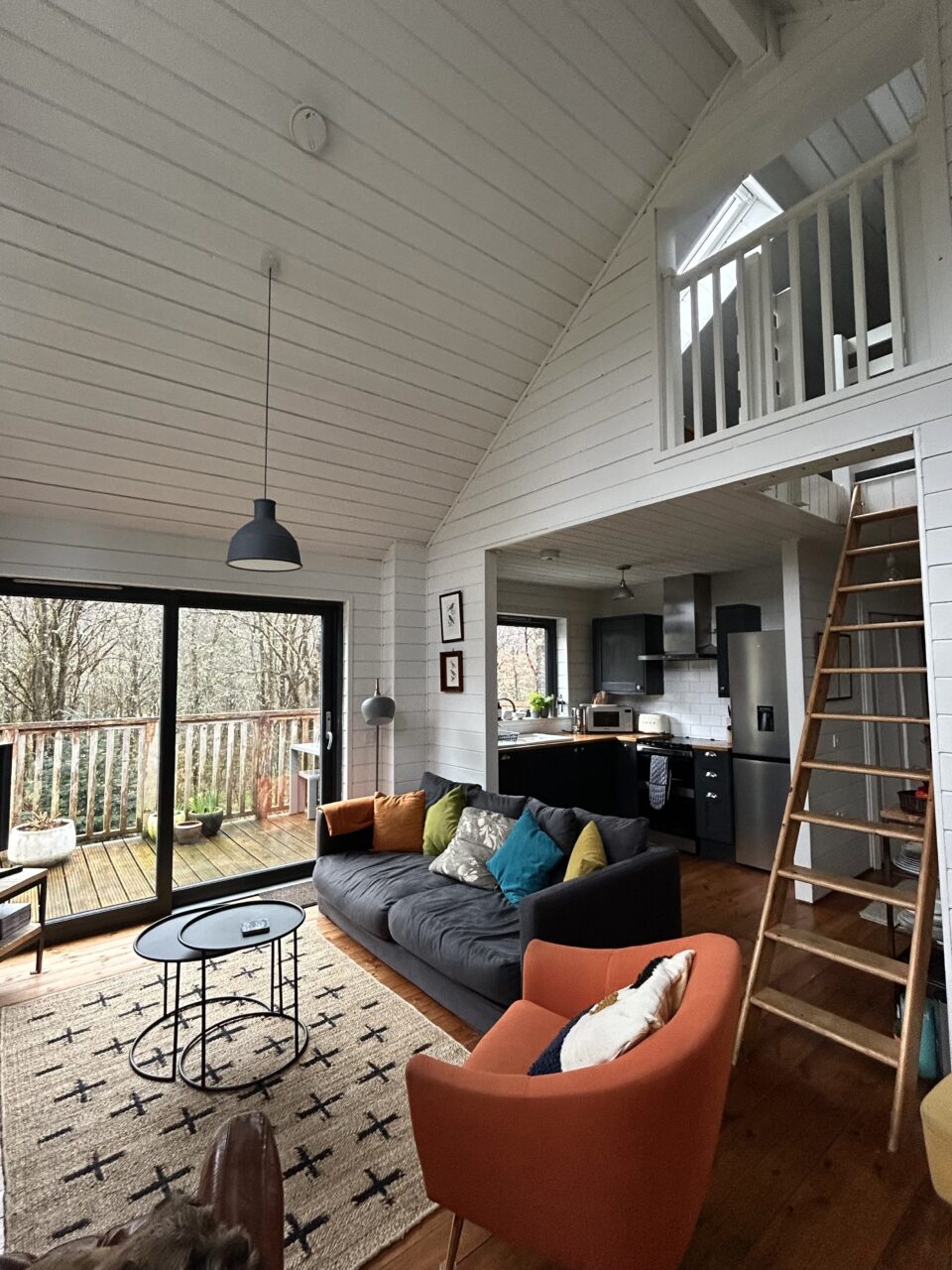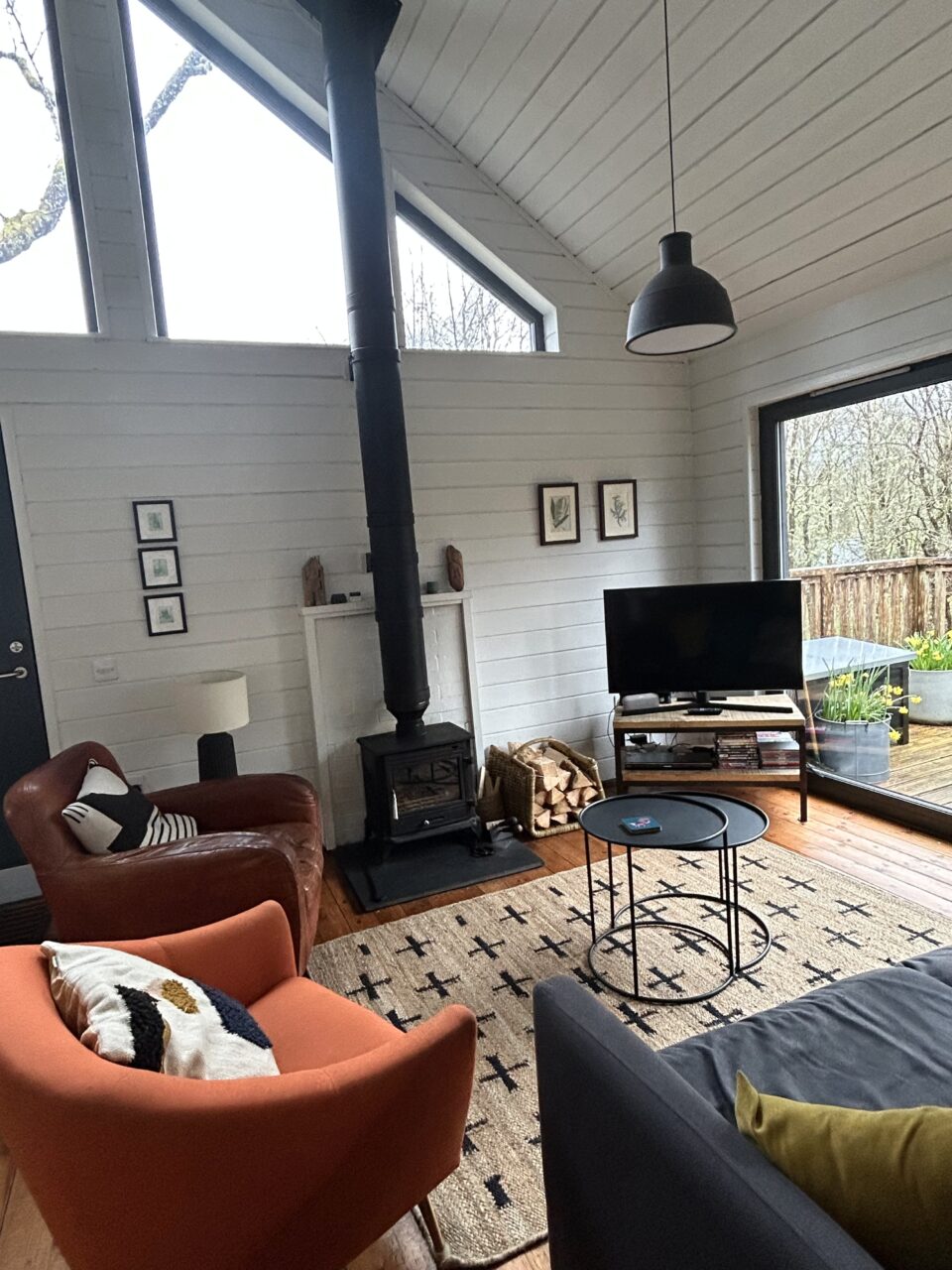 The cabin is finished throughout with Scandinavian style painted timber lining, double glazed, highly insulated, well heated and Kitchen livingsuitable for year round use. It provides a balance of luxury and comfort while maintaining the character, charm and feel of a true log cabin in a peaceful woodland location.