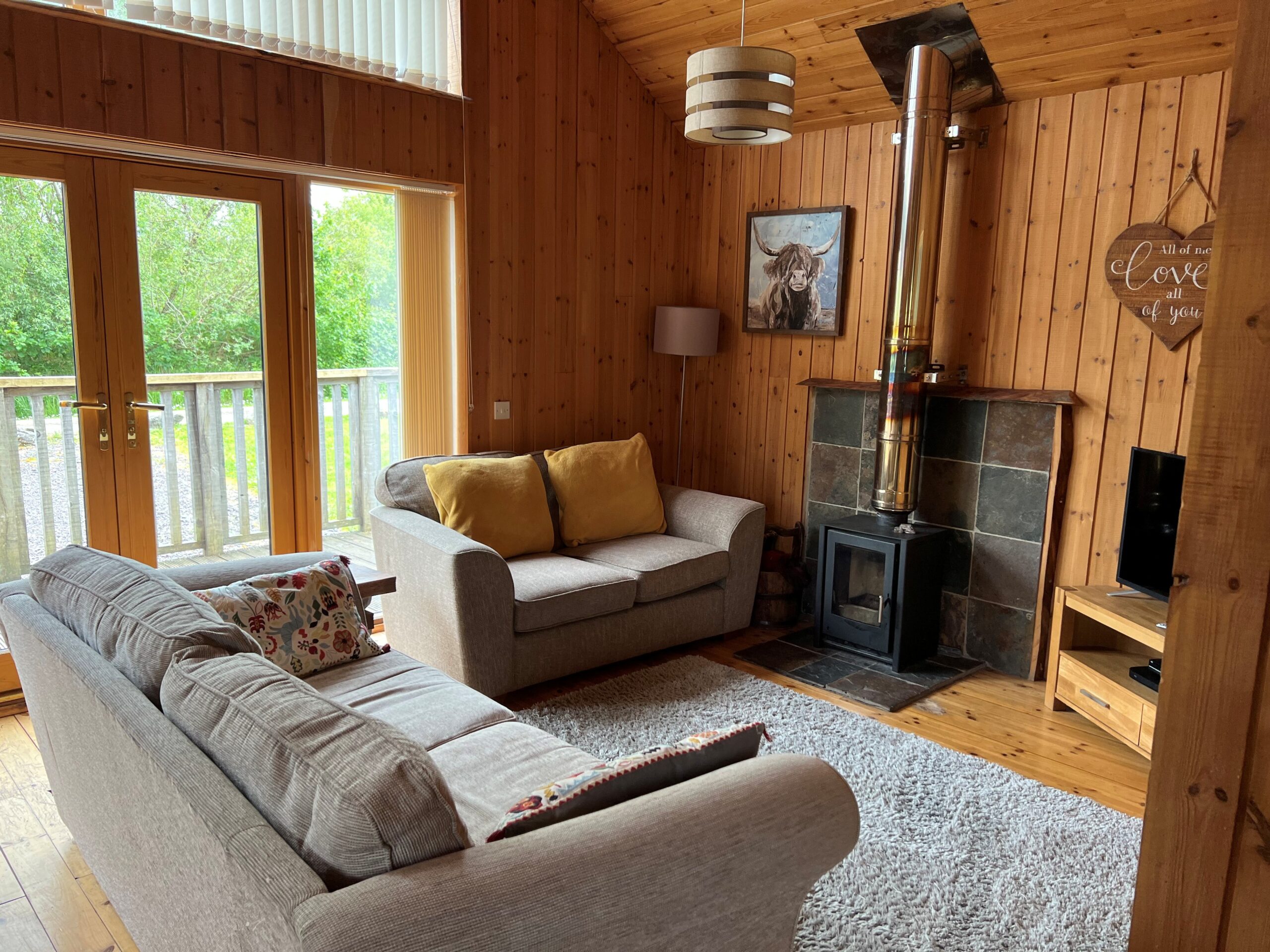 The cabin is timber lined throughout, double glazed, highly insulated, well heated and suitable for year round use. It provides a balance of luxury and comfort while maintaining the character, charm and feel of a true log cabin in a quiet woodland location.